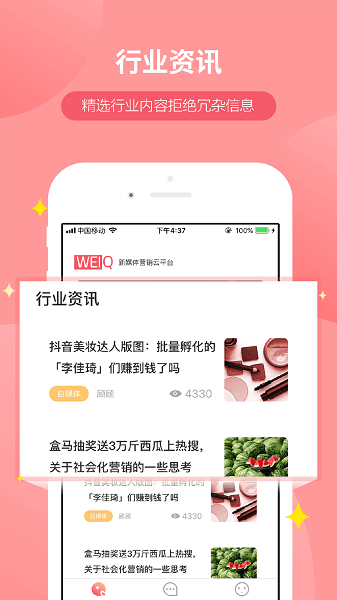 weiq自媒体app让自媒体人员能够实现自我的价值,轻松添加自己的账号,支持一键管理多个平台,随时随地在线接单,有着权威准确的数据支持,覆盖营销的全部过程。