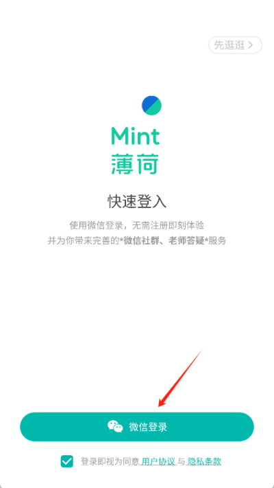1、打开薄荷阅读后可使用微信账号进行快速登录,无需额外注册即可进入学习界面开始使用。