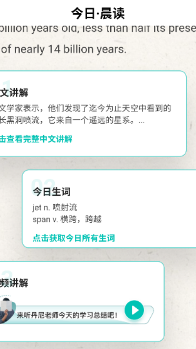 3、在阅读与学习模块中每日进行约10分钟阅读训练,通过原文与音频结合方式完成边听边读学习,并完成课后练习与讲义巩固。