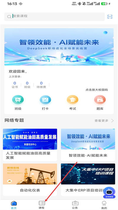 1、进入新培在线App首页,点击底部导航栏的课程选项,进入课程分类页面。
