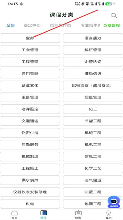 2、跳转至课程分类页,点击全部按钮,查看所有课程列表。