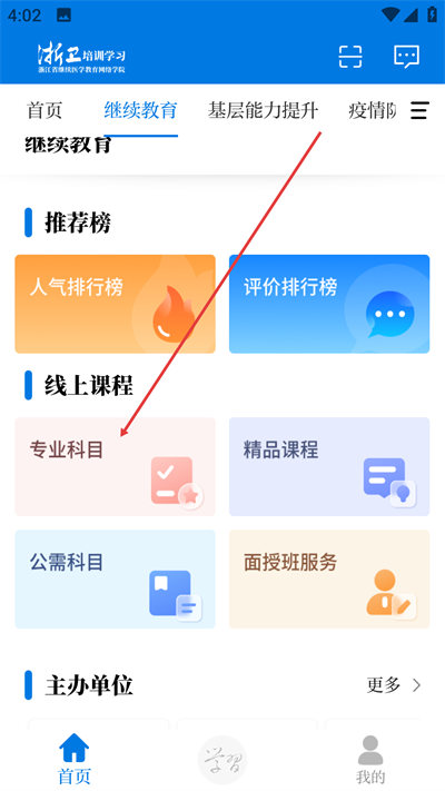 4、切换到继续教育页面,点击专业科目板块,查看课程列表。