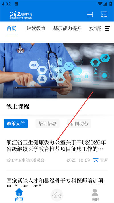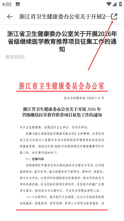 1、打开浙里学习App首页,点击政策文件列表中的目标通知,跳转到文件详情页。