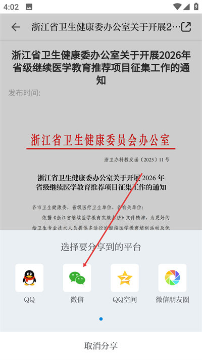 3、分享界面选择微信作为分享平台,即可将文件分享至微信。