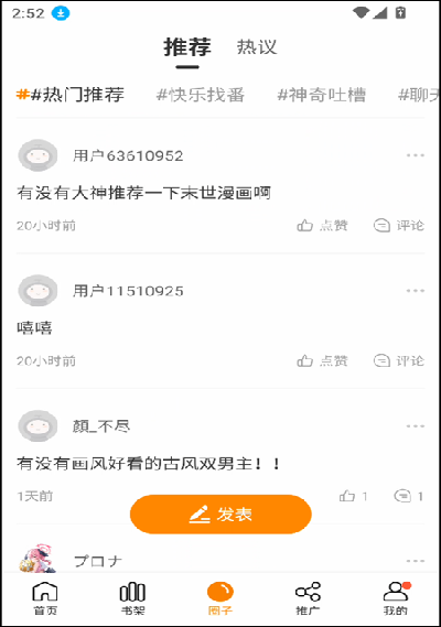 3、在圈子界面,用户可发布快乐找番、神奇吐槽等话题,与漫迷交流心得、分享作品,丰富追漫社交体验。