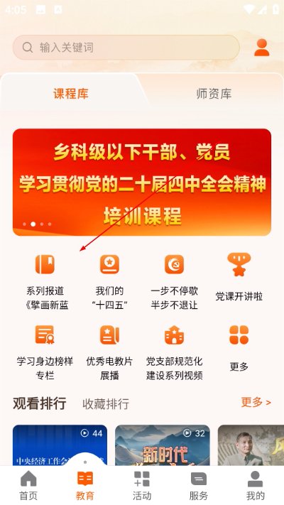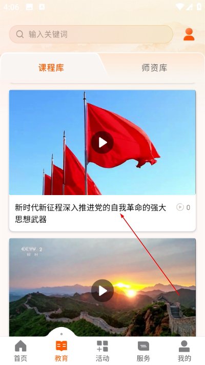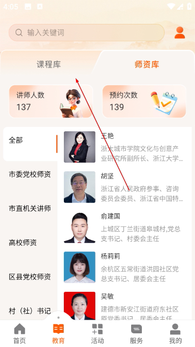 1、找到功能栏的教育选项,切换到教育页面,查看课程库与师资库相关内容。