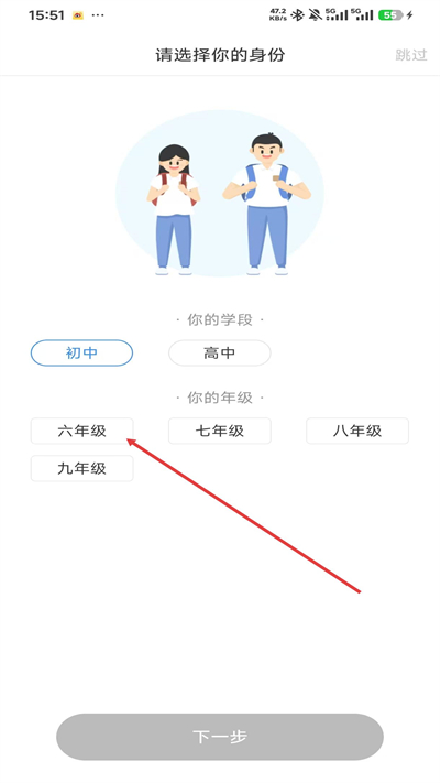 1、进入身份选择页面,选择对应学段与六年级选项,完成个人身份信息设置。