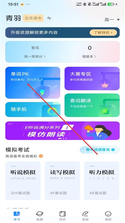 2、打开E听说中学APP学习主页,选择单词PK功能入口,进入单词PK对战页面。