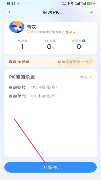 3、单词PK页面确认PK范围后,选择开始PK按钮,启动单词对战答题流程。