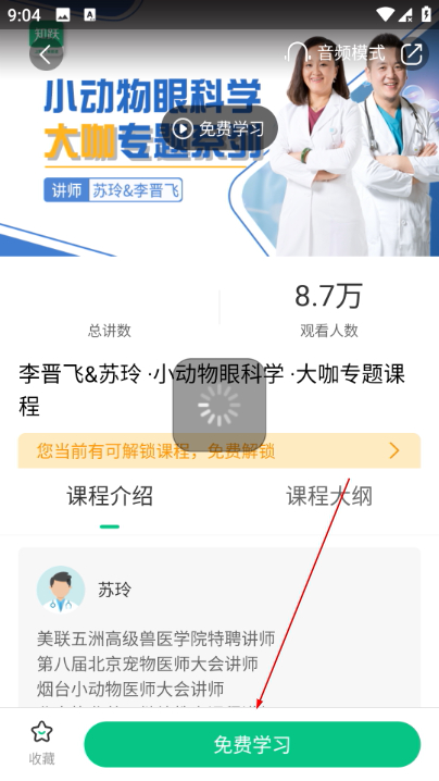 4、详情页面点击底部的免费学习,即可打开课程学习界面,开始观看课程内容。