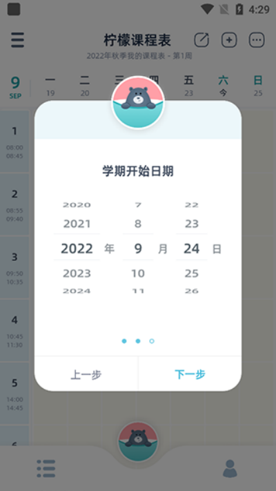 2、进入时间设置页面,选择并设定课程开始日期,确定课表启用时间范围。