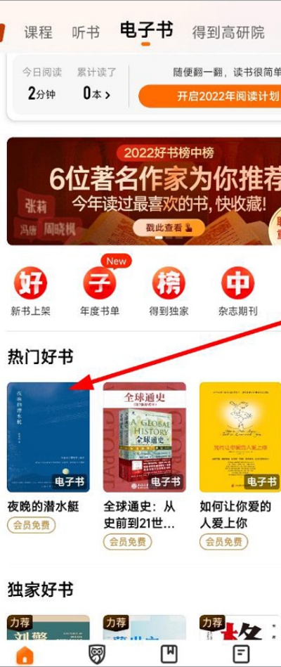 1、进入得到App后,在首页找到并点击“电子书”栏目,在热门推荐中选择感兴趣的书籍并打开进入阅读模式。