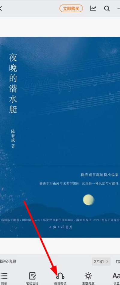 2、进入书籍阅读界面后,点击屏幕唤出底部工具栏,可使用目录、笔记划线、语音朗读、亮度与设置等功能,选择语音朗读进入播放页面。