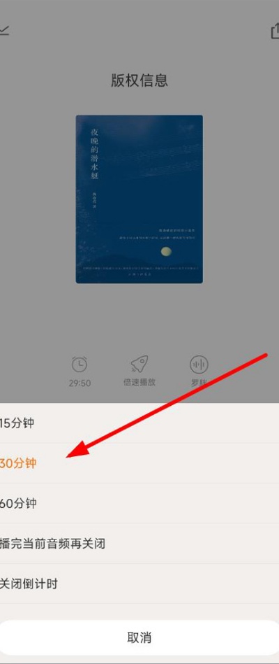 4、在定时关闭列表中可选择15分钟、30分钟、60分钟或播完当前音频自动关闭等模式,根据需求选择合适的关闭时间完成设置。
