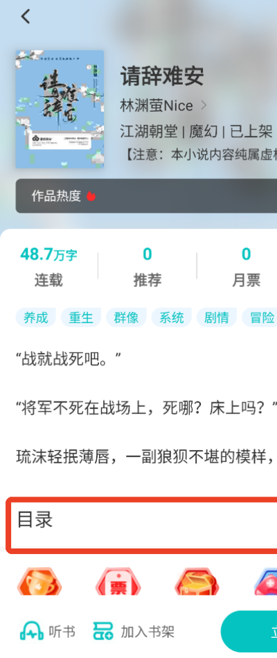 1、进入有毒小说应用后打开目标小说详情页面,在阅读界面中找到并点击“目录”入口进入章节列表页面。