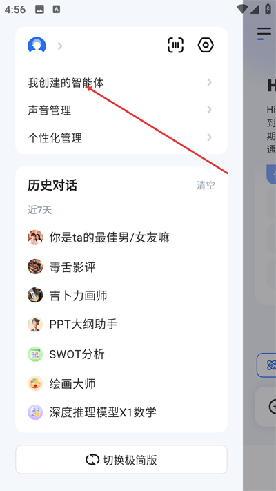 1、进入应用的个人中心界面后,点击我创建的智能体选项,进入对应的管理页面。