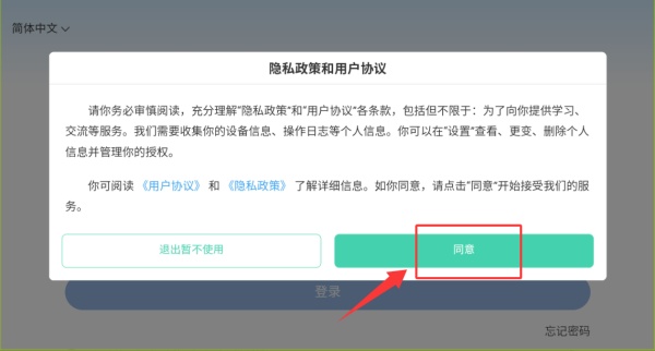 2、进入下一步后,系统会弹出服务协议与相关说明窗口,需要仔细查看页面中的条款内容,然后点击“同意”选项进行确认,完成协议确认后即可继续进入登录页面。