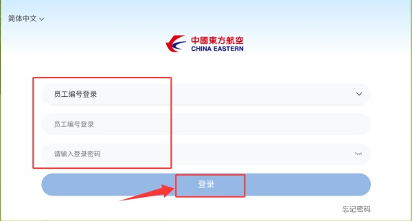 3、在登录界面中选择“员工编号登录”的方式,根据页面提示依次填写员工编号及相关信息,确认填写内容无误后点击登录按钮,即可成功进入东航易学app开始使用。