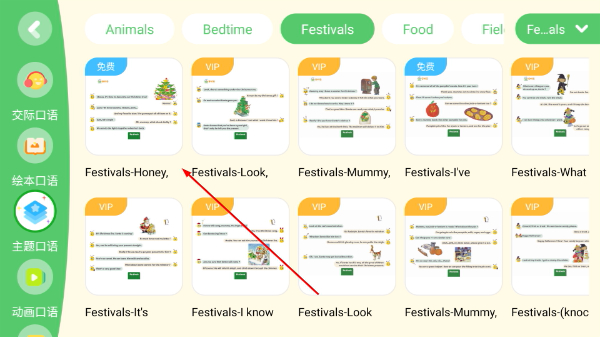 2、在主题口语界面上方,点击上方的标签,切换到对应主题的口语练习列表。
