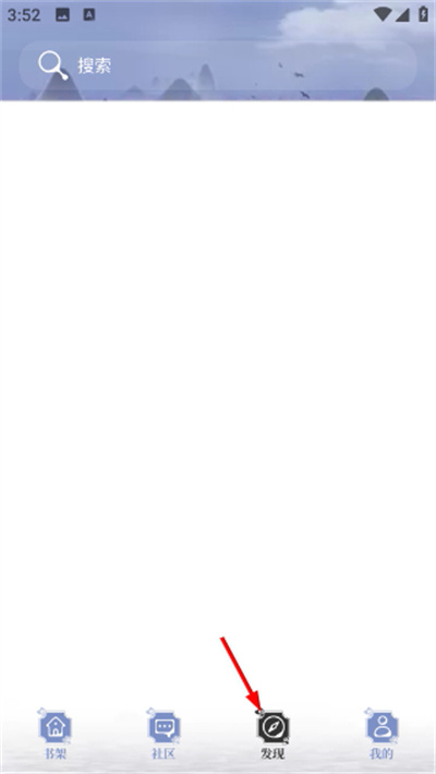 1、进入软件初始首页界面,底部设有书架社区发现我的四个功能导航栏,点击中间的发现按钮,进入小说发现专属页面。