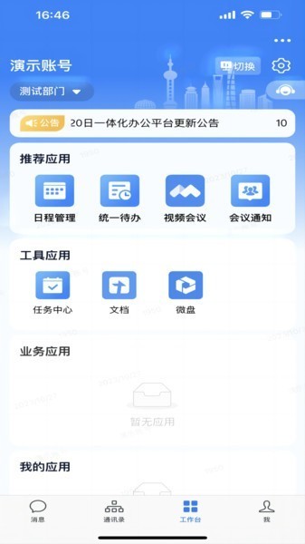 建设统一待办、任务中心、问卷调查等共性工具应用,集成提供日程管理、在线音视频会议、在线文档等多类共性应用。
