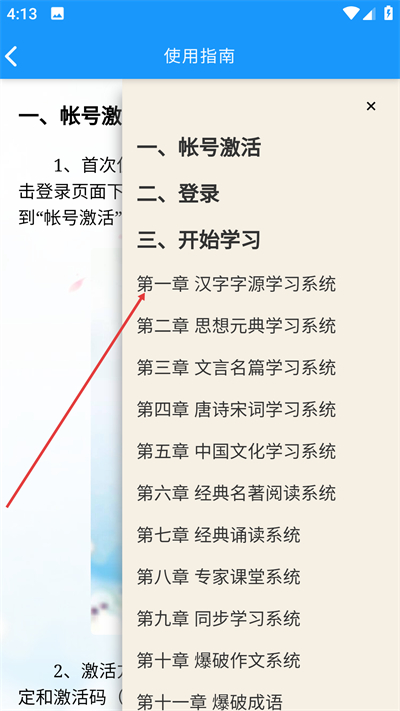 2、目录中找到第一章 汉字字源学习系统,可快速跳转至对应章节的内容。