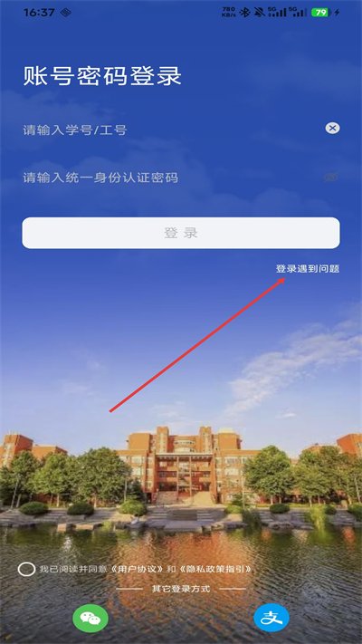 1、账号密码登录界面中,输入学号和密码即可登录,若登录遇到问题,可点击登录遇到问题获取帮助。