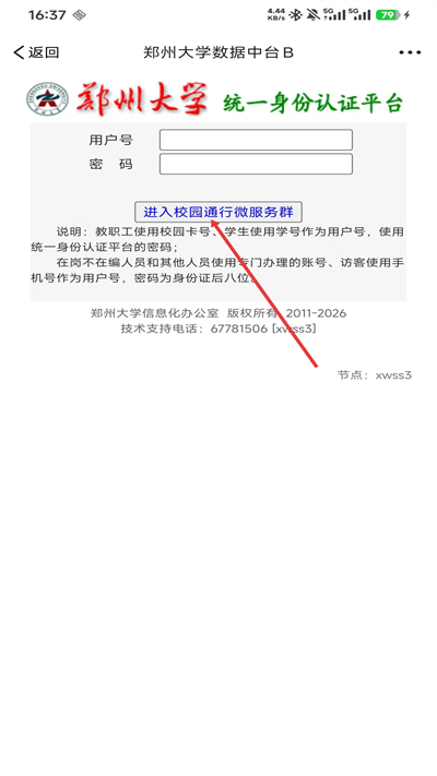 3、进入郑州大学统一身份认证平台,点击进入校园通行微服务群按钮。