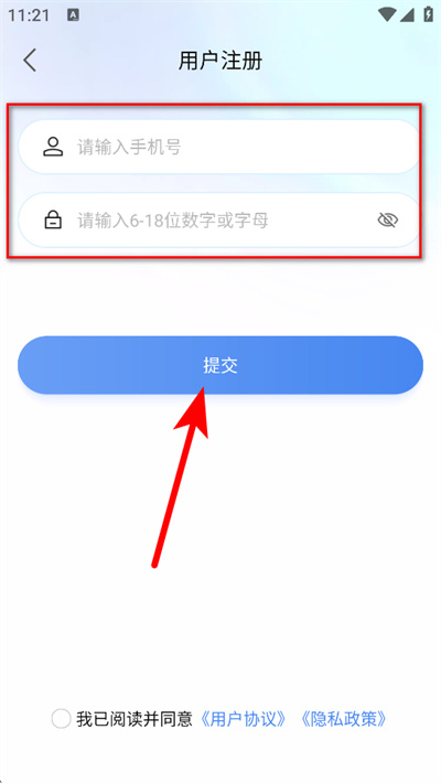 4、填写手机号和密码,勾选同意协议后点击提交,完成账号注册。