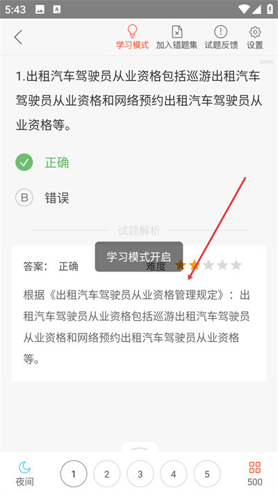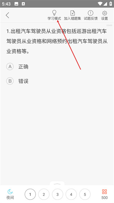 3、进入题目练习界面,点击上方的学习模式选项,可开启学习模式查看题目解析。
