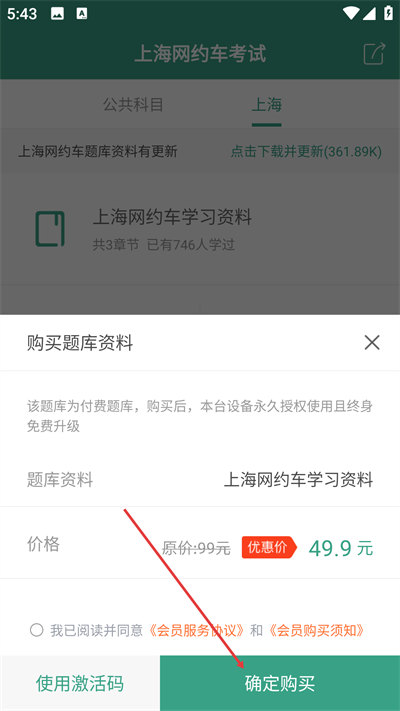 2、在购买题库资料弹窗中,勾选协议后点击确定购买,即可购买对应的学习资料题库。