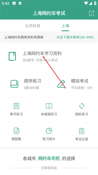 1、进入上海网约车考试页面,点击上海网约车学习资料选项,进入学习资料的相关操作界面。