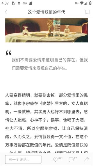 一个App是一款极具韩寒风格的阅读软件,以简约清新著称,在满足阅读需求的前提下,加入许多新鲜具有特色元素,在尽量带给用户丰富优质的阅读体验同时,也可以分享自己阅读的喜悦,与作者或者与你志同道合的读者们在同一平台下沟通留言,让阅读不在那么纯粹,同时其独树一帜的阅读模式,也在为用户打在一个良好的阅读环境,你可以在这款软件上安静的阅读,在任何地方任何地点,发现新的领地,快来这里写下你的故事和心情,生成属于你的小故事吧!