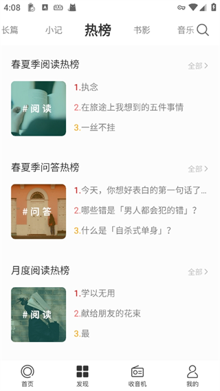 3、点击发现栏,可以查阅各个专栏,包括阅读、图文、专题、热搜榜、问答、音乐和影视等。