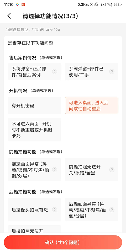 4、接着填写设备使用情况,功能情况,外观等,最后点击确认;