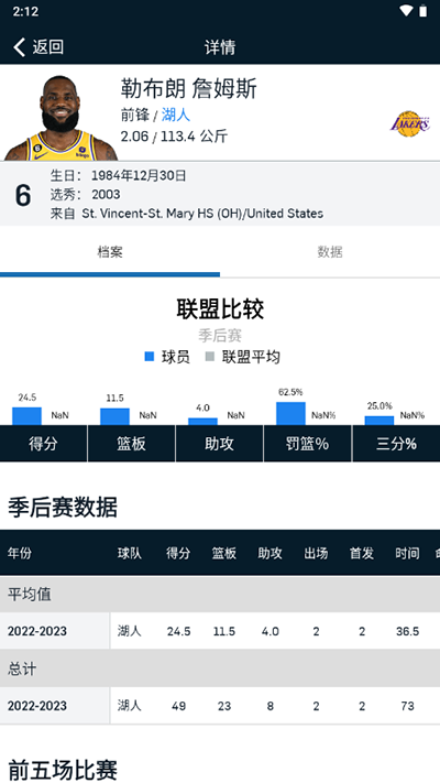 5、点击球队球员即可查看相对应球员的一个详情数据情况