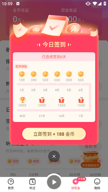 赚钱的主要方式:签到,听书,看视频。其他听书赚金币是平台主打的功能。