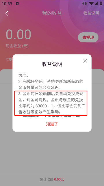 目前,平台的金币兑换比例33000金币=1元,金币每天凌晨会自动兑换为现金。
