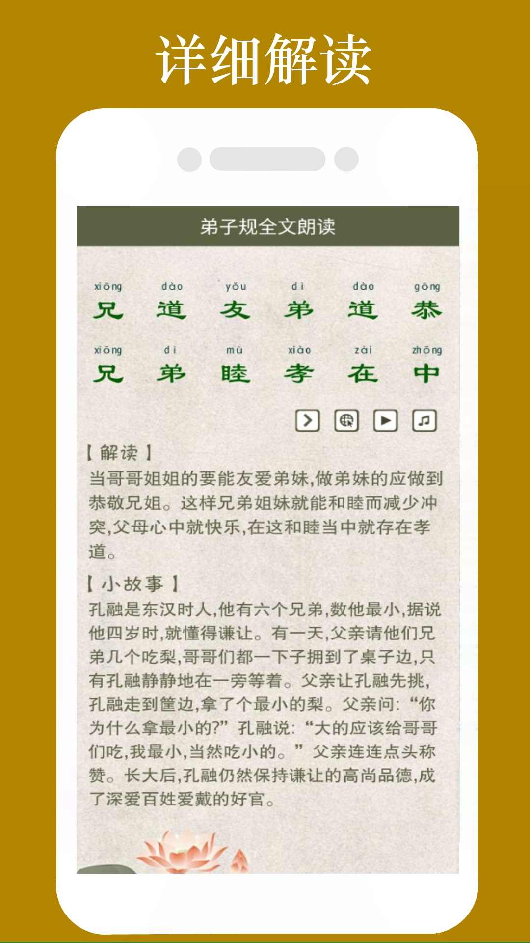 2.两种学习模式:一种分段朗读解释便于孩子家长共同理解学习弟子规;一种全文顺序循环朗读,逐行跟踪滚动显示当前朗读内容,便于孩子跟随一起咏读学习。