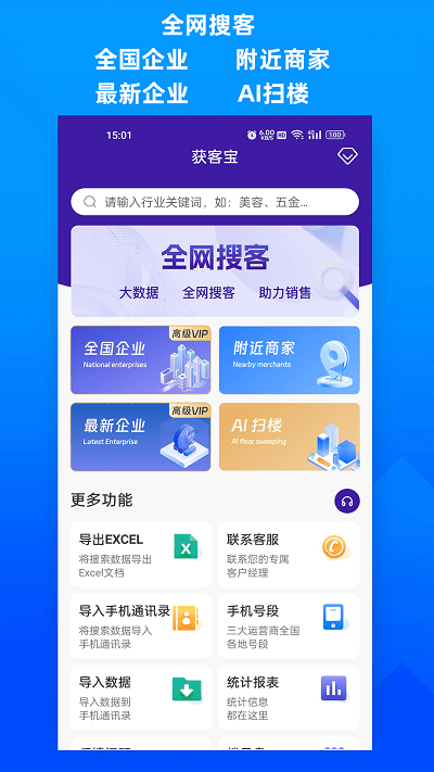 适用于销售、业务员、生产厂家、批发商、经销商、渠道商,各行各业有线上营销销售需求的人员找客户搜客户找线索