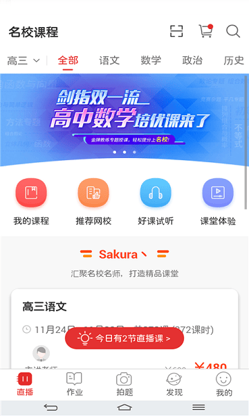 - 直播:全国一线名师课程,在线互动课堂,模拟真实课堂,让学生学习更有效。