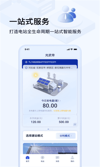 是一款功能强大的电站服务软件。软件能够为电站提供全方位、覆盖整个生命周期的智能服务,用户能够直观的查看今日发电量、本月收益、累计收益等信息,更好的为未来做出规划。电站的进度包括设计、签约、仓配、施工、并网等都能实时掌握,满足用户的使用需求。