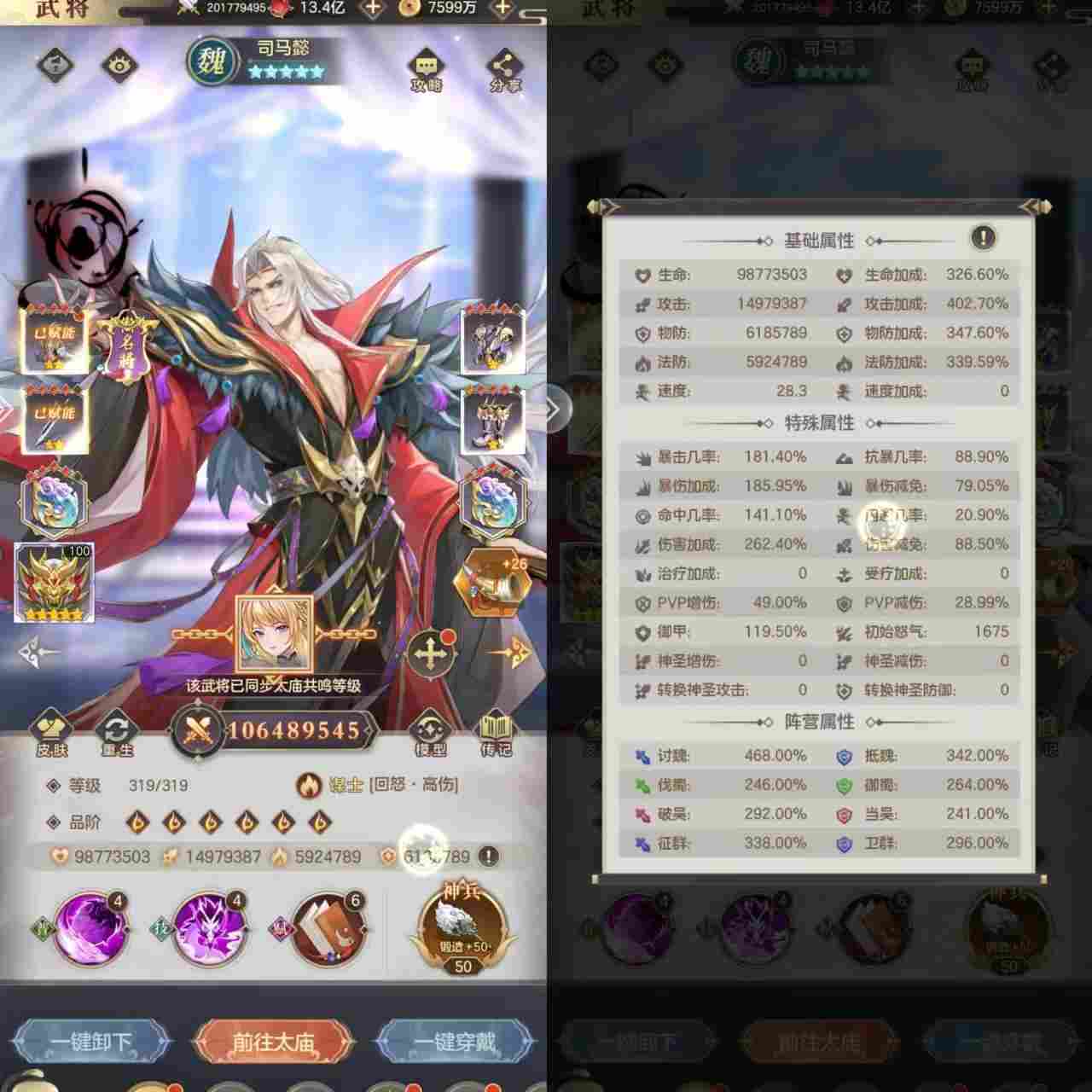 三.天命装备顺序首先先把天命武器二星剑弄出来,然后赋能,技能至少三条每回合开始百分之30释放怒气,剩下的可以洗攻击加成/命中(赋能有五个技能,先全部解锁了再洗)。天命二星剑后就先集齐一套天命(武器,头盔,鞋子,战甲)。一套天命后,第二件二星就弄头盔,洗五加伤最好。有了天命二星剑和二星头盔,可以给甄姬弄二星天命剑了(非常建议这个)然后再继续弄剩余的二星,等司马懿全部二星后,可以考虑拉武器到五星,但是这是一个非常漫长的。