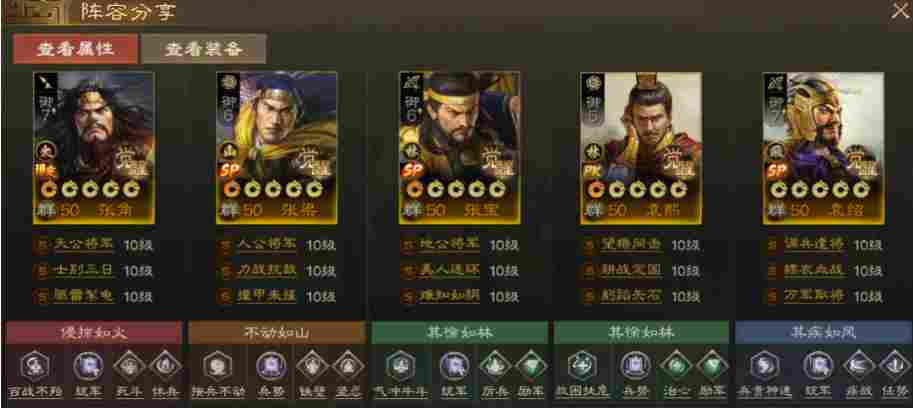 队伍输出以召唤兵+SP张角输出为主,通过一堆召唤兵提高SP张角叠【黄天】的效率,让SP张角每回合都能高层数放自带战法。同时多个召唤兵对SP张梁带【不动如山】也有收益,很容易叠满4层,让SP张梁免伤突破100%,更轻松分摊队友伤害。