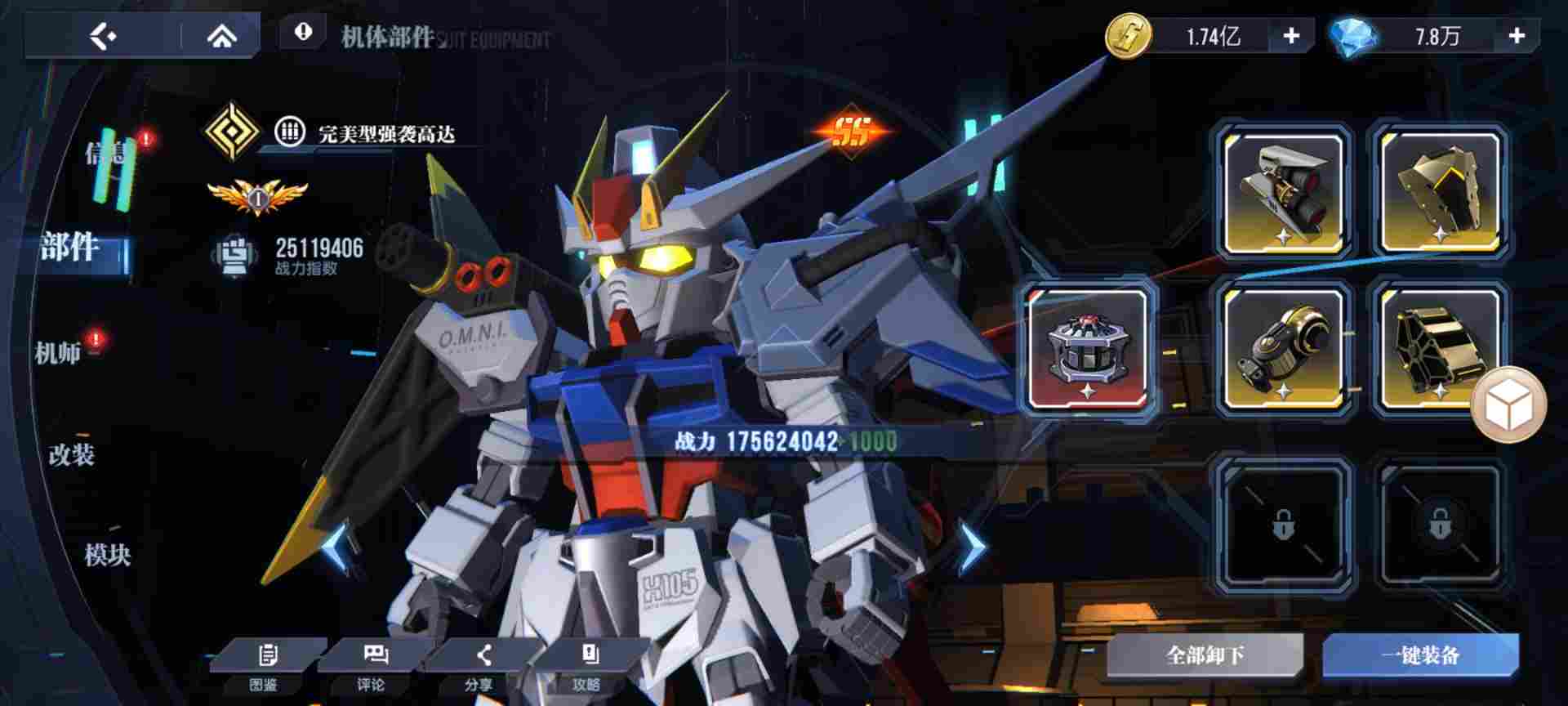 再看下面两张图,先说普通部件,最好带成套的,因为加的百分比属性很多,战力加的很多。再说特殊部件,第一张图带的加攻击75000的红色特殊部件,第二张图带的反应炉(25技能伤害率25能量),只有特殊部件不一样,上图比下图多160万战力。