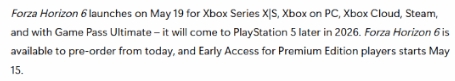 此外,官方确认《极限竞速:地平线6》将于“今年晚些时候”登陆PlayStation 5,这也意味着PS5玩家可以在2026年年底前体验到这款作品。
