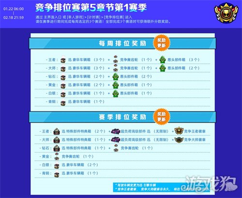 同时,竞争排位赛的奖励还会在本次更新后进行更新,驾驶车辆也将变更为迅 引擎车辆!具体请参考下图: