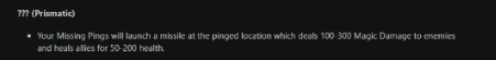 你的【问号标记】(Missing Pings)将向标记位置发射一枚导弹,对敌人造成 100–300 点魔法伤害,并为盟友回复 50–200 点生命值。