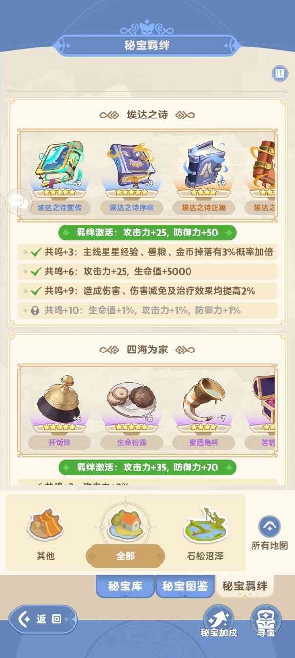 资源类获取翻倍秘宝(如捕风袋)和百分比伤害提升秘宝(如赞美诗)可以单独优先共鸣+9,以保证获取到最大收益。