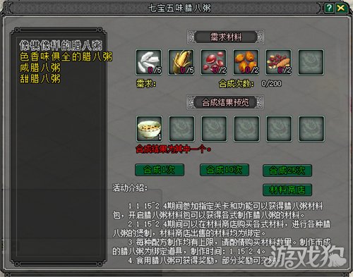 活动期间,大侠参与副本、日常活动可获取食材制作四种腊八粥赢取经验、稀有道具等奖励,春启积分可兑换额外好礼。